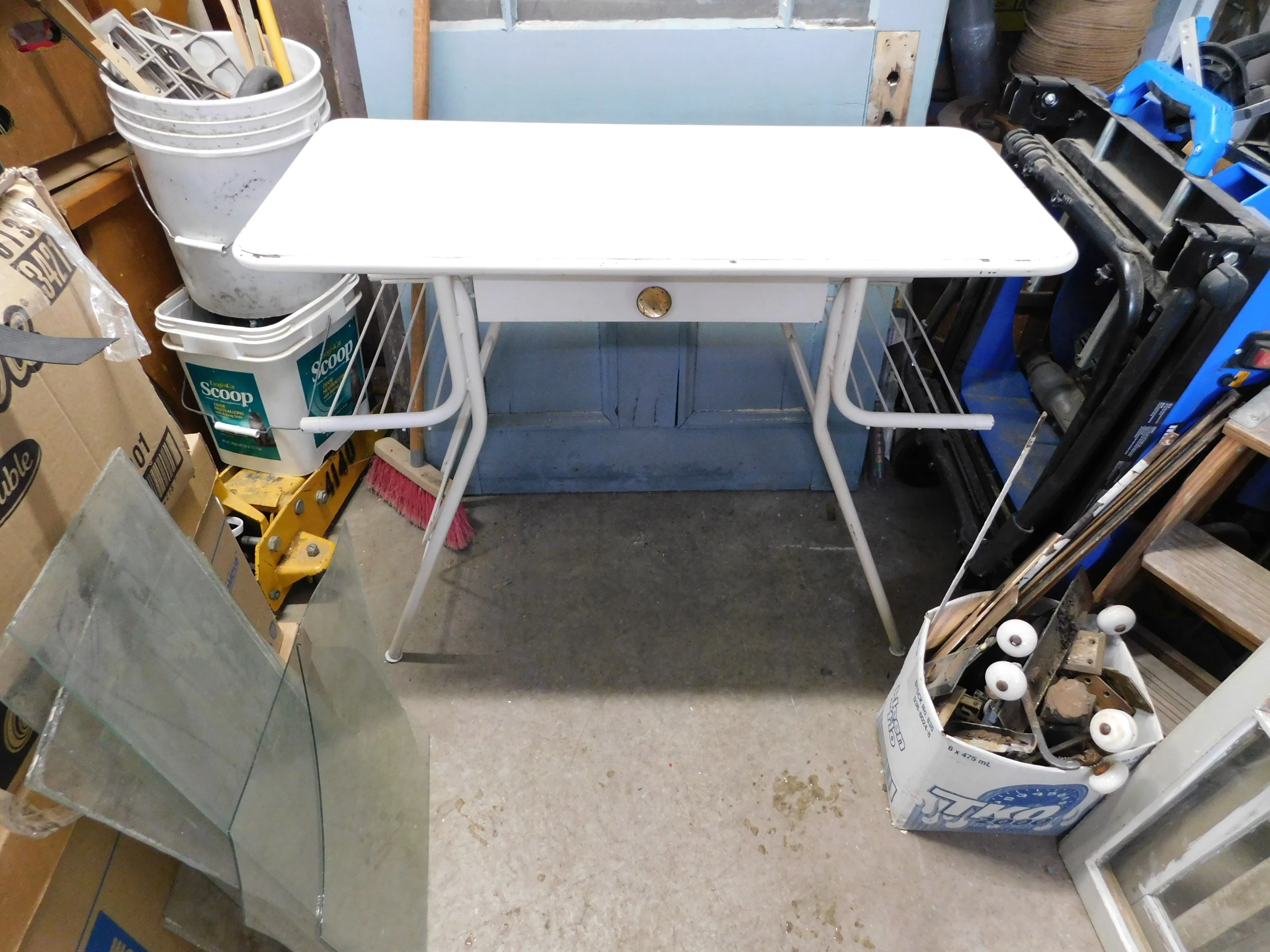 belle table vintage # 13160.145 en bois et métal avec 1 tiroir et 2 tablette 36" 1/2 x 16" 1/2 x x 29" 1/2 H 125$
