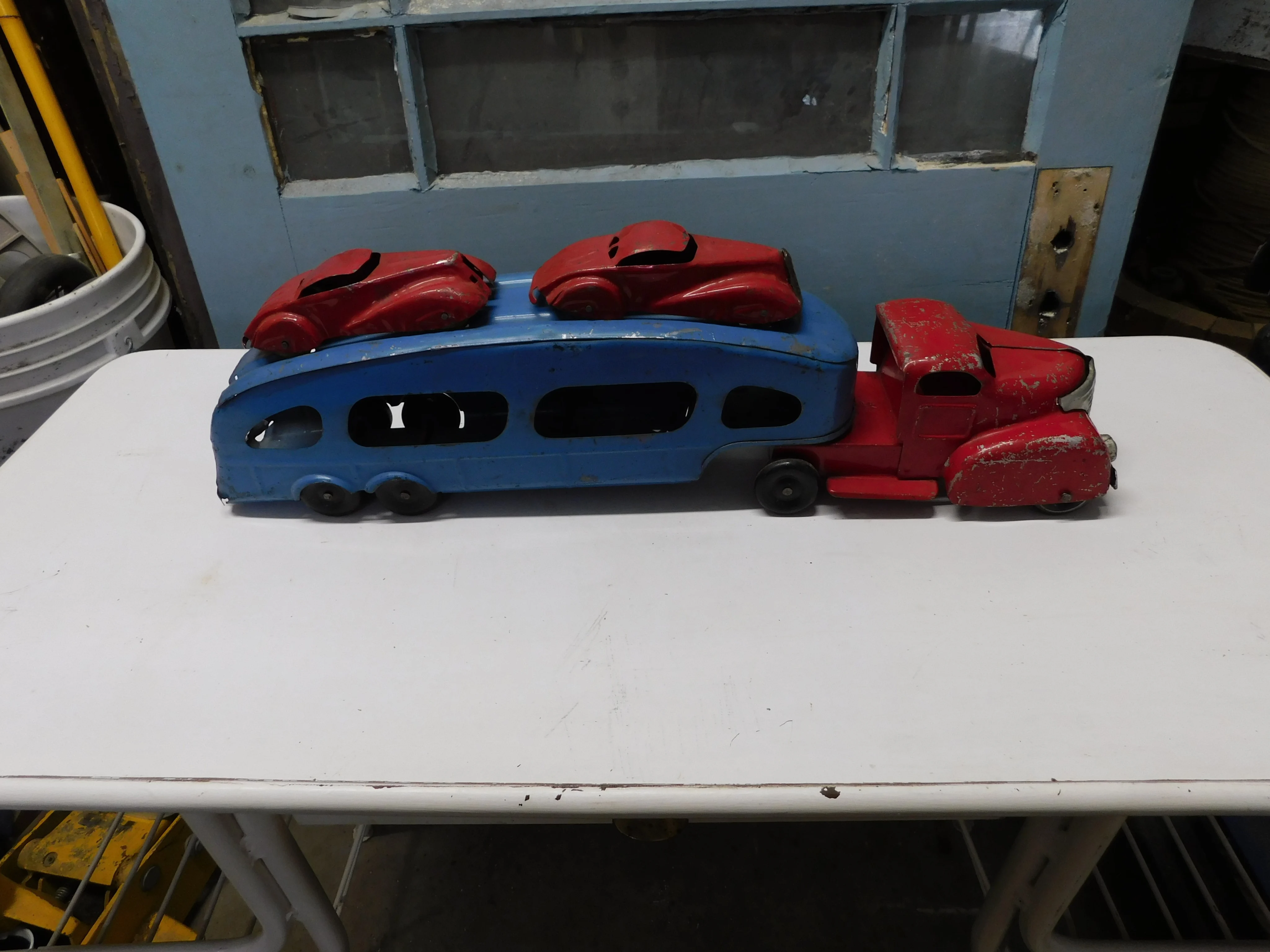 Beau camion transporteur marx # 13161.2 de luxe avec 2 auto en métal dont 1 qui manque la grille belle condition 22" long circa 1940-50 350$
