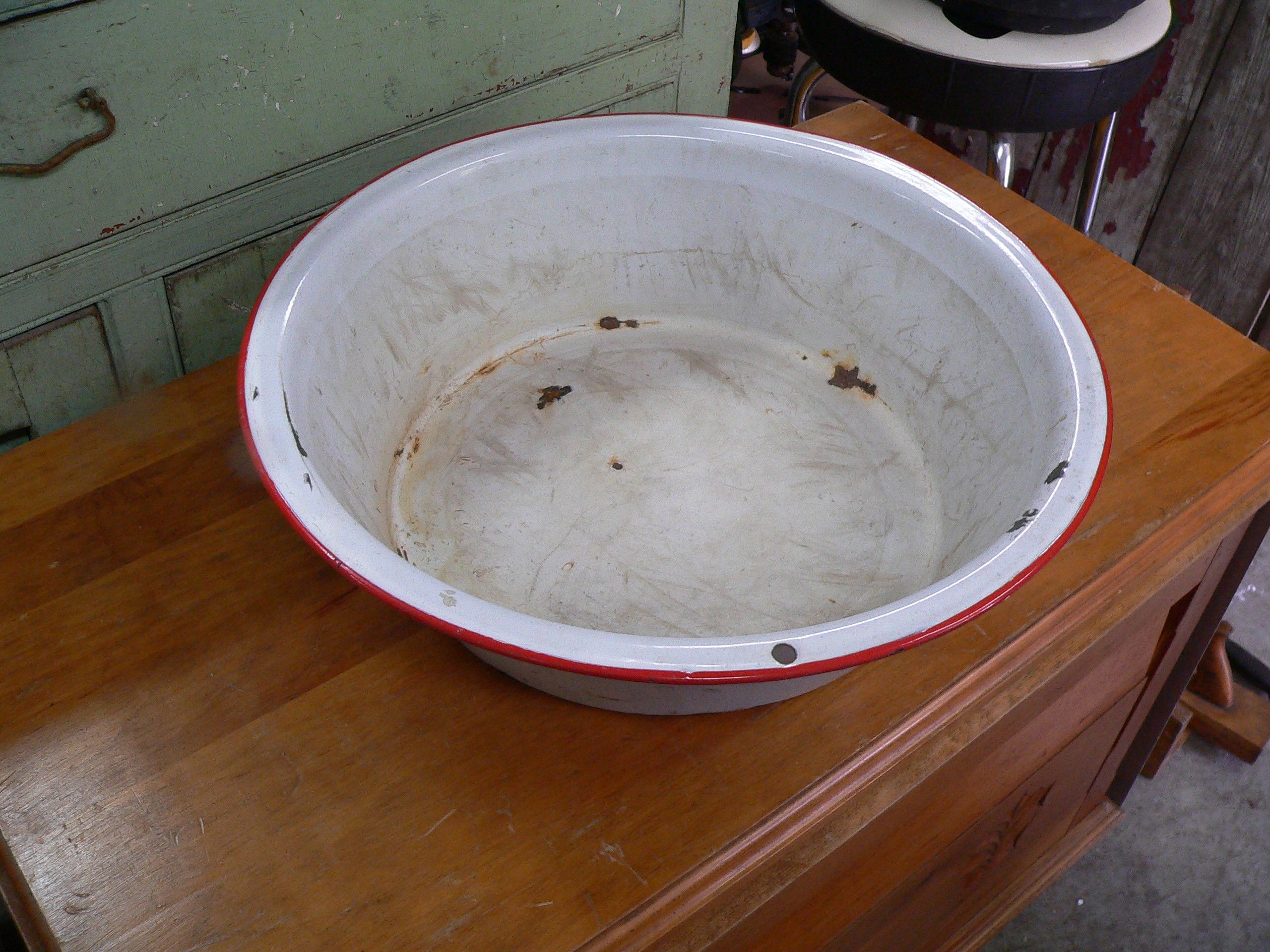 Bol antique en métal émailler # 4366.1 18''1/2 dia x 5"H 20$